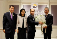 คุณสุรงค์ บูลกุล นายกสมาคมบริษัทจดทะเบียนไทย คุณเกศรา มัญชุศรี กรรมการและผู้จัดการ ตลาดหลักทรัพย์แห่งประเทศไทย และคุณชนินท์ ว่องกุศลกิจ ที่ปรึกษานายกสมาคมบริษัทจดทะเบียนไทย มอบดอกไม้แสดงความยินดีแก่ คุณรพี สุจริตกุล ในโอกาส เข้ารับตำแหน่งเลขาธิการ สำนักงานคณะกรรมการ ก.ล.ต.