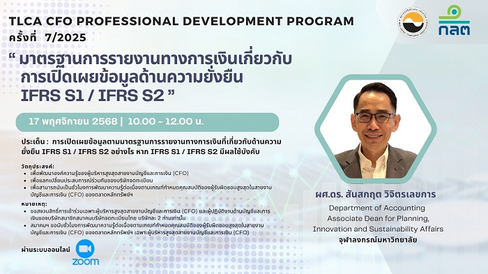 TLCA CFO Professional Development Program (TLCA CFO CPD) ครั้งที่ 7/2025 หัวข้อ มาตรฐานการรายงานทางการเงินเกี่ยวกับการเปิดเผยข้อมูลด้านความยั่งยืน IFRS S1 / IFRS S2
